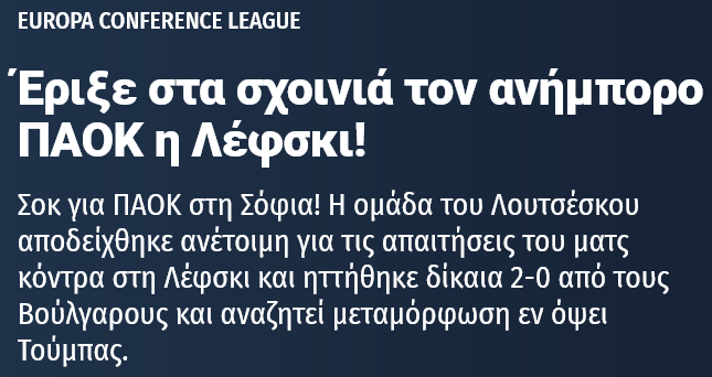 Μετά τον ταλαίπωρο Ολυμπιακό που πήρε ισοπαλία χθες στο Ισραήλ με την Μακάμπι Χάιφα για τα προκριματικά του Ch.L., ήρθε σήμερα η σφαλιάρα στον ΠΑΟΚ από την θεωρητικά υποδεέστερη Λέφσκι στη Σόφια (2-0), ενώ μόνο ο Άρης έκανε το καθήκον του απέναντι στην αδύναμη Γκόμελ (5-1). Έτσι η συνολική βαθμολογία της χώρας μας διαμορφώνεται ως […]
