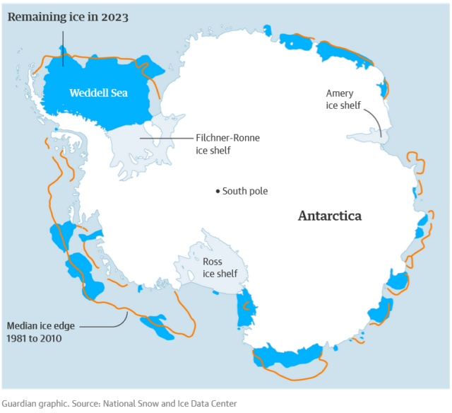 Η περιοχή των θαλάσσιων πάγων γύρω από την Ανταρκτική έχει φτάσει σε ιστορικό χαμηλό, με τους επιστήμονες να αναφέρουν ότι «δεν έχουν ξαναδεί τέτοια ακραία κατάσταση». (Με το κόκκινο φαίνεται στον χάρτη της Ανταρκτικής η έκταση των πάγων έως το 2010)