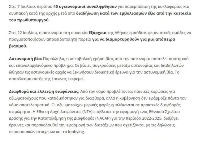 Σε μια Έκθεση, καταπέλτη για το διεφθαρμένο καθεστώς Μητσοτάκη, το Αμερικάνικο Department of States στηλιτεύει την κατάσταση στη χώρα, κάνοντας λόγο για τις υποκλοπές, τη διαφθορά, την αισχροκέρδεια, την έλλειψη διαφάνειας, την αστυνομική βία, το προσφυγικό και τα push backs, την έλλειψη ελευθερίας έκφρασης, τη λίστα Πέτσα, που μοίρασε κρατικό χρήμα με αδιαφανείς διαδικασίες, το Qatargate, την Καϊλή κοκ.