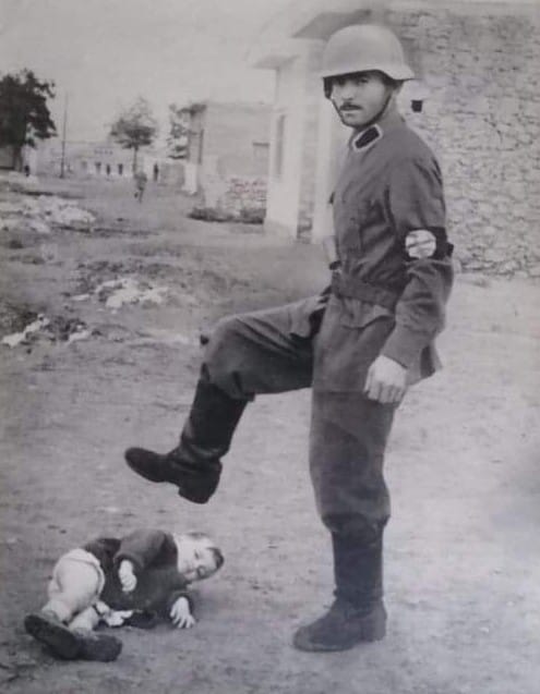 Οι πιο μελανές σελίδες της ιστορίας, όμως παραμένουν επιμελώς κρυμμένες στο σκοτάδι. Ένα ταμπού της δημόσιας μνήμης του πολέμου είναι οι Έλληνες συνεργάτες των Γερμανών. Εκτός από τους δωσίλογους, τους μαυραγορίτες, τους Χίτες και τους γερμανοτσολιάδες, στον Γερμανικό στρατό υπηρετούσαν και πολλοί Έλληνες, οι οποίοι συγκροτούσαν μονάδες του τακτικού γερμανικού στρατού (Βέρμαχτ) και των SS.Ένας τέτοιος στρατιώτης είναι στην φωτογραφία που έχει τραβηχτεί στην Αθήνα.