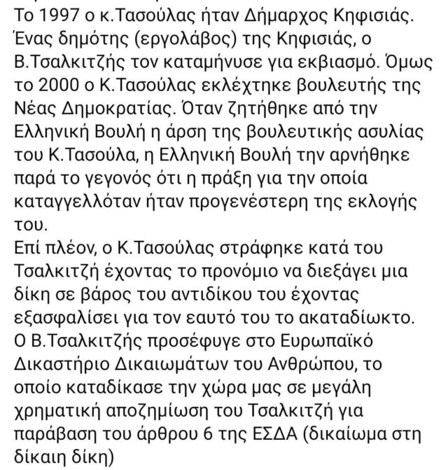 • Ήταν το 2001, όταν ο εργολάβος Β. Τ. κατήγγειλε -με υποβολή μήνυσης- τον πρώην δήμαρχο της Κηφισιάς Κωνσταντίνο Τασούλα: Του είχε ζητήσει ο Τασούλας, σύμφωνα με τον μηνυτή, «μίζα» εβδομήντα εκατομμυρίων δρχ. για τη νομιμοποίηση οικοπέδου… Την εποχή που θα δικαζόταν, ήταν πια βουλευτής, οπότε η υπόθεση έφτασε στη Βουλή, όπου φυσικά, η πλειοψηφία αρνήθηκε να άρει την ασυλία του (2 φορές) για να δικαστεί…
