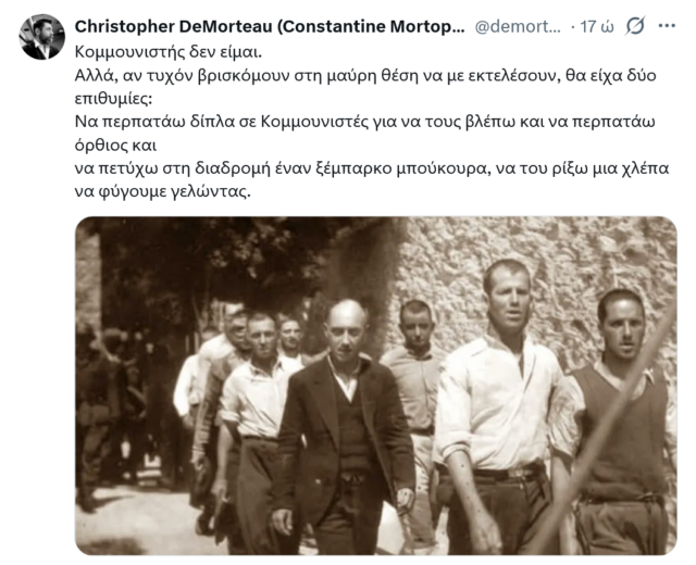 Και μπορεί οι δωσίλογοι, οι μαυραγορίτες και οι ταγματασφαλίτες να έμειναν ατιμώρητοι μετά την Κατοχή (η μοναδική χώρα στην Ευρώπη που συνέβη αυτό) και οι ιδεολογικοί και βιολογικοί τους απόγονοι να ζουν και να βασιλεύουν, αλλά δεν μπορούν ακόμα να χωνέψουν ότι οι πατριώτες αυτοί είχαν το σθένος να αντιμετωπίζουν τον θάνατο με το κεφάλι ψηλά και τη γροθιά σφιγμένη!