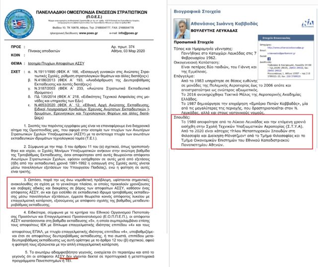 Αν αληθεύει αυτό που αλιεύσαμε από το x.com, ότι δηλαδή ο κ. Καββαδάς, τον οποίο τοποθέτησε στη θέση του γιαλαντζί πτυχιούχου Μακάριου Λαζαρίδη, ο Κούλης, ως απόφοιτος της ΣΤΥΑ (Σχολή Τεχνικών Υπαξιωματικών Αεροπορίας), δεν είχε δικαίωμα φοίτησης σε μεταπτυχιακά προγράμματα σπουδών, όπως επιβεβαιώνει και η ομοσπονδία τους που διαμαρτύρεται για αυτόν τον λόγο στις 3/3/2020, δημιουργείται μια απορία: