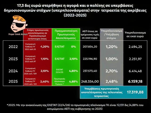 Με τον στόχο του Προϋπολογισμού του 2025 να είναι στα 2,4%, το υπερπλεόνασμα είναι στο 2,88% ή στο υπέρογκο πόσο των 6,1 δις (βλ. Πίνακα).
